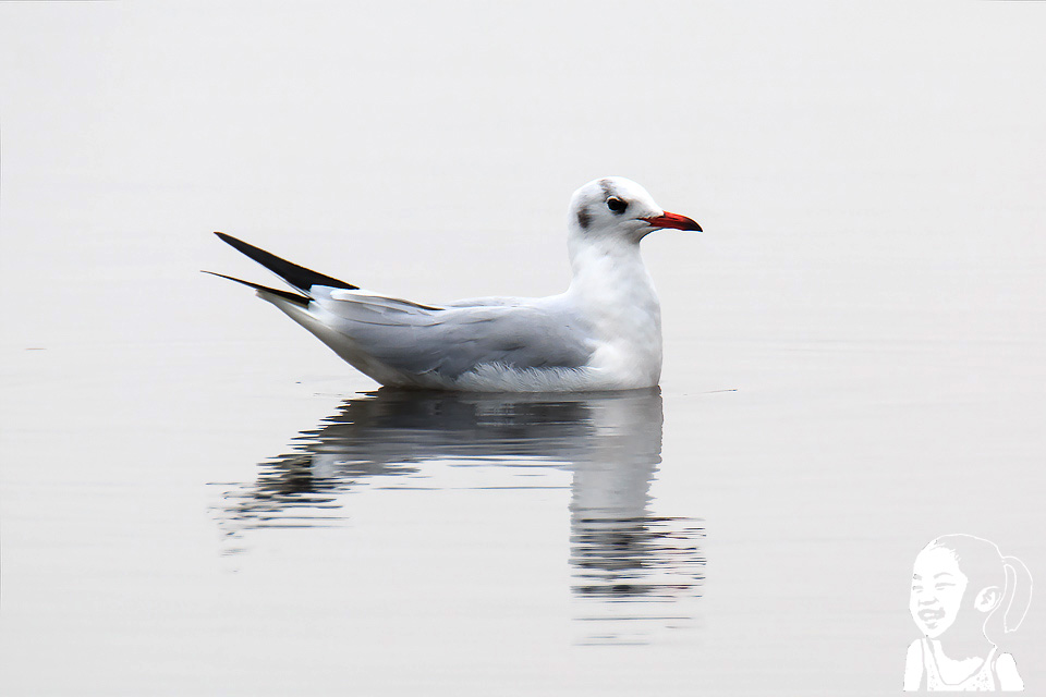 在到鰲鼓溼地賞鳥的時候,剛到北堤就看見遠遠有一隻白色的鴨子在游泳,趕緊停車拍攝,由大砲望出去,才發現其是紅嘴鷗,紅嘴鷗,屬於鷗科的飛羽,在台灣算是普遍的冬候鳥,此照片為非繁殖羽的紅嘴鷗,眼上至頭頂有淡褐色斑,眼後有黑斑!