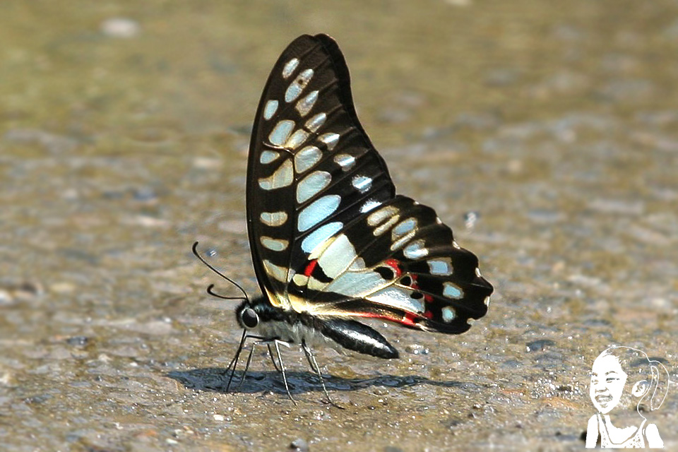 記得2003年我購入人生中的第一台數位單眼相機EOS 10D,鏡頭除了原本EF28-80mm F3.5-5.6 USM外,我還買了一隻便宜的長鏡頭EF 75-300mm F4-5.6,來拍望遠的東西。而在買了相機與鏡頭沒多久,我到新北烏來的燕子湖遊玩,長鏡頭馬上發揮作用,清楚拍了一隻停在路上喝水的蝴蝶,這是青斑鳳蝶,屬於鳳蝶科。