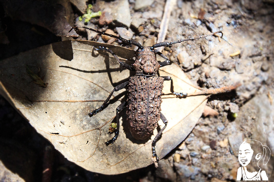 回程半路上Dr. Wang發現了一隻罕見昆蟲,感覺這長得好像天牛,回家後查圖鑑,正確名稱是:蓬萊瘤條天牛,又稱為, 臺灣瘤條天牛,屬於天牛科的昆蟲,主要棲息於海拔300~1200公尺地區,成蟲活動時期為5~6月。身體成深褐色或黑色,外緣具尖刺,表面具鋸齒狀棘刺,而其最大的辨識特徵應該就是前胸背板具臉譜狀突起了,側緣具尖刺,翅鞘具縱條瘤狀突。根據台灣生物多樣性入口網(TaiBIF),這天牛是台灣特有種。