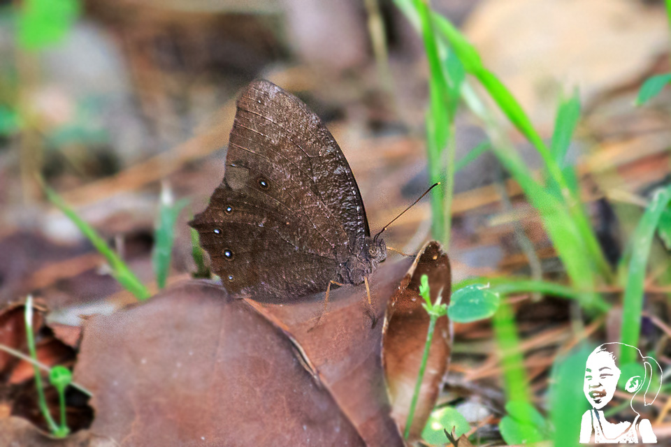 2015年8月初的一個周末,我們計劃去爬谷關七雄的東卯山,此山我在2012年就與羽球球友一同拜訪過,這是主要是帶阿禎來,因為她爬完這座,就完登谷關七雄了。我們周六近午才由台中出發,先到東卯山下的同心行露營區露營,這個營區很不錯,占地寬廣,而且還可以到一旁的大甲溪戲水。悠閒的在營區發呆,忽然發現有兩三種蝴蝶飛過帳篷,終於有一種停了下來,趕緊拿出小砲EF70-300mm IS來拍攝。當這蝴蝶停在地上枯葉堆中,還真是有點不容易發現其蹤跡。